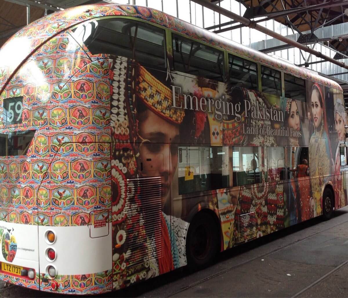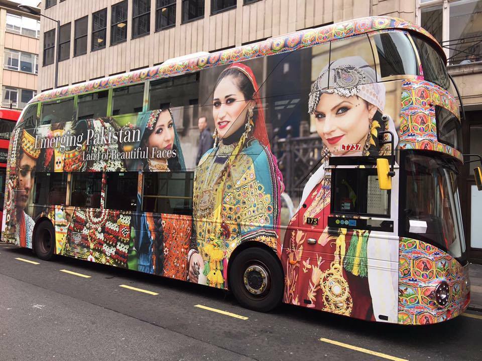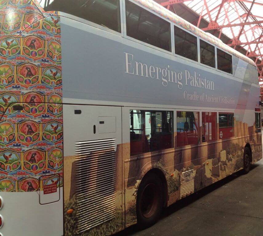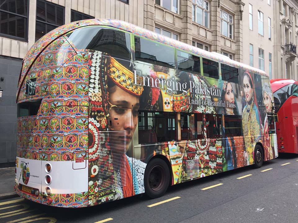 London’s iconic red double-decker buses are carrying brand Pakistan on the roads of Central London, the hub of world tourists. This ultimate branding campaign is running under the theme of “Emerging Pakistan” and will continue for four weeks.